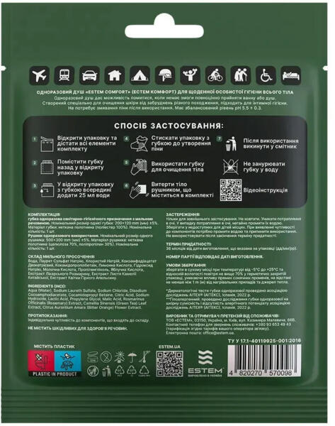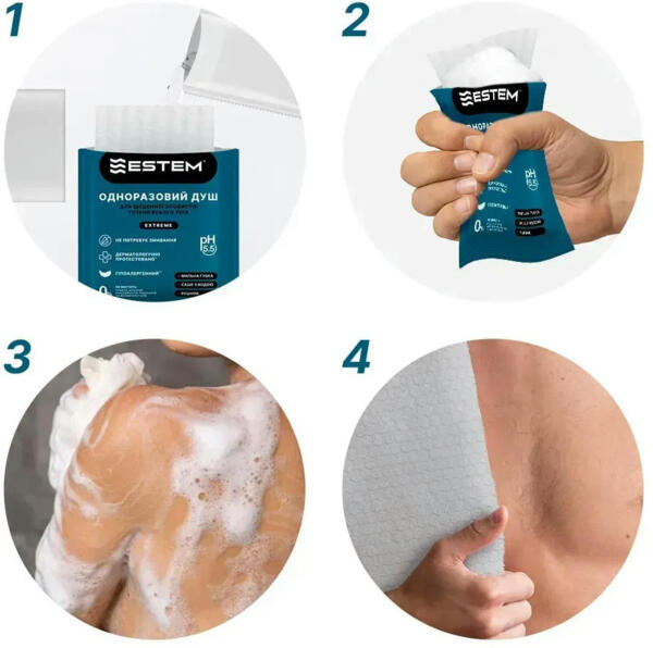 Одноразовий душ Estem Comfort ідеально підходить для підтримки особистої гігієни в умовах, коли доступ до води обмежений. Кожен комплект включає мильну губку і рушник, що забезпечують швидке та ефективне очищення шкіри в будь-яких ситуаціях.