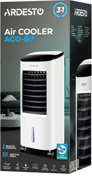 Завдяки максимальній швидкості повітряного потоку 4 м/с Ardesto ACO-B7 швидко створює прохолоду там, де це необхідно. Пристрій оснащений знімним резервуаром для води об'ємом 7 л. Два акумулятори холоду забезпечують ефективне охолодження. Мобільність пристрою зумовлена зручною ручкою для перенесення та обертовими коліщатками, що дають змогу легко переміщати його між кімнатами.