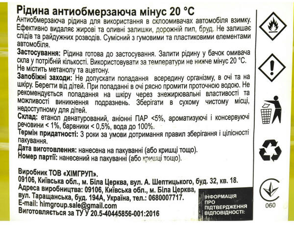 Зимова рідина для омивача скла призначена для застосування в холодну пору року за мінусових температур. Головна її відмінність від літньої - здатність не замерзати в морозну погоду. Швидко і якісно видаляє всі забруднення, характерні для холодного періоду - сльоту, наліт від дорожніх реагентів, сніг, ожеледь. Не залишає на склі розводів. Рідина виготовлена на основі високоякісного етилового спирту подвійної перегонки, завдяки чому не має різкого запаху. Зберігає плинність і властивості до зазначеної температури. Не містить розчинників і токсичних речовин. Повністю безпечна для лакофарбового покриття, гумових ущільнювачів і пластикових кузовних елементів. Не засмічує канали та форсунки системи омивання скла.