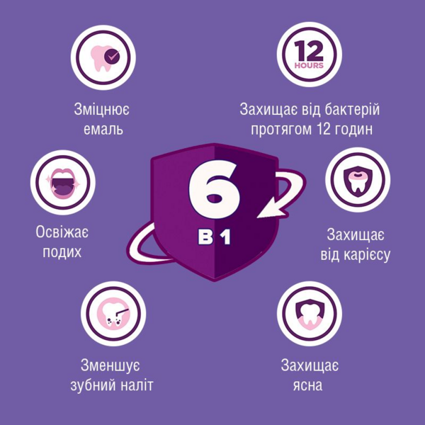 При використанні двічі на день покращує гігієну порожнини рота і забезпечує комплексний захист завдяки 6 перевагам: