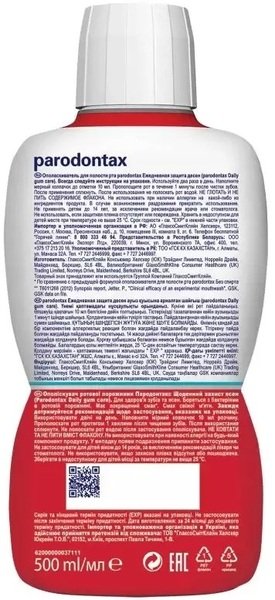 Ополіскувач Parodontax Щоденний захист ясен спеціально розроблений для щоденного застосування на тривалій основі у разі комплексного застосування разом із зубною пастою.