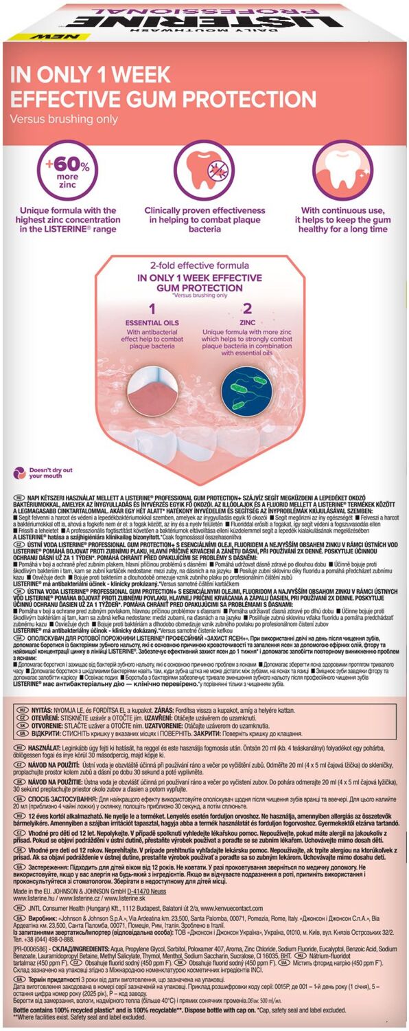 При використанні двічі на день після чищення зубів, допомагає боротися із бактеріями зубного нальоту, які є основною причиною кровоточивості та запалення ясен за допомогою ефірних олій, фтору та найвищої концентрації цинку в лінійці Listerine. Забезпечує ефективний захист ясен до 1 тижня і допомагає запобігти повторному виникненню проблем з яснами.