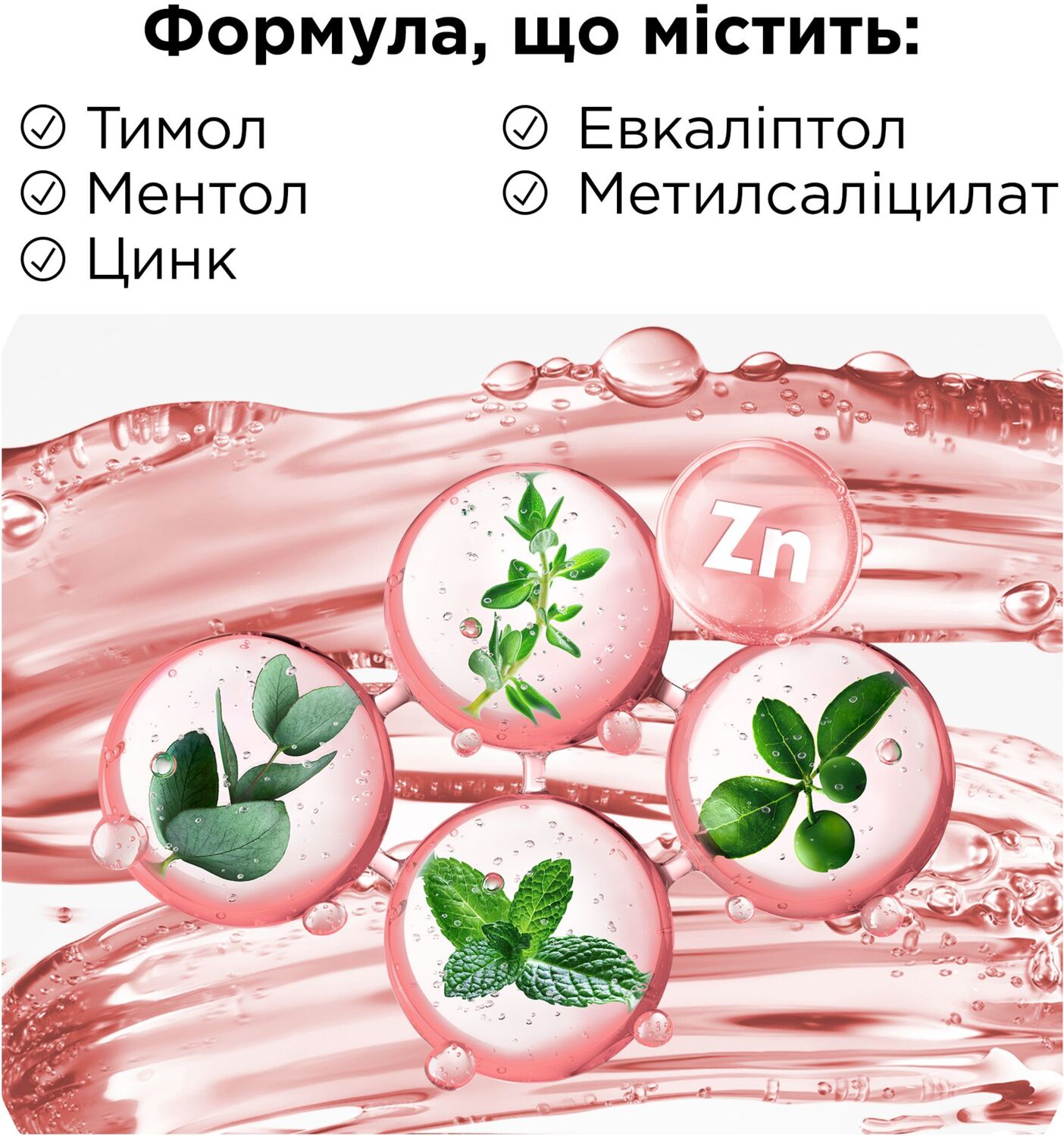 - Допомагає боротися зі шкідливими бактеріями навіть там, куди зубна щітка не може дістати: між зубами, на яснах та язиці.