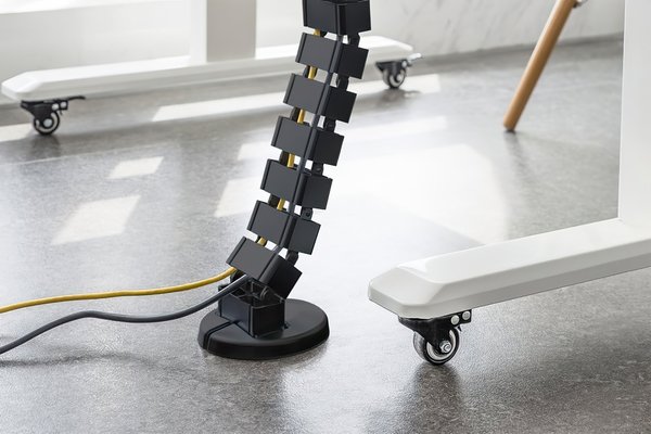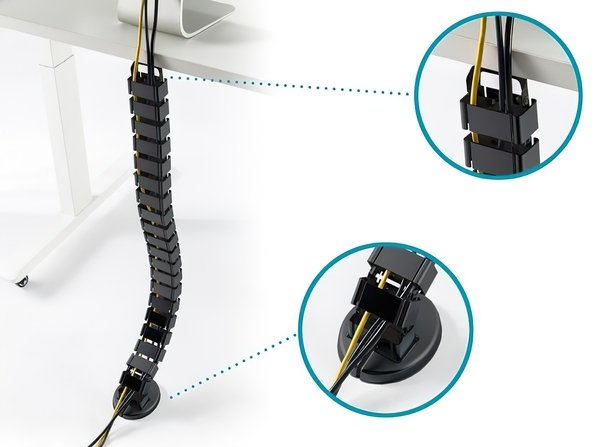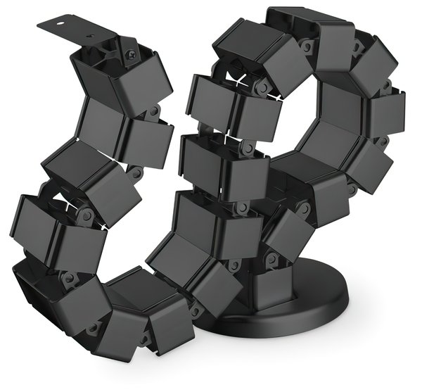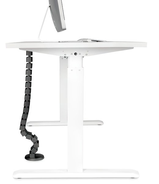 Окремі ланки можуть бути видалені або додані в залежності від вимог, тому довжину можна індивідуально відрегулювати до максимальної висоти столу. Коли стіл з регульованою висотою опускається, кабельна траса акуратно складається, що не заплутуючись і не викликаючи безладу з кабелями. Обтяжені металева ніжка кабельної траси стійко стоїть на підлозі. Кріплення до столу здійснюється куточком на верхньому кінці кабельної змійки. Його можна використовувати для максимальної висоти столу 130 см. Всередині кабельної розводки є 4 окремих каналу для акуратної організації всіх видів кабелів. Кожен модуль має гнучке отвір для зручного введення і виведення кабелів. Приведіть у порядок місце під столом!