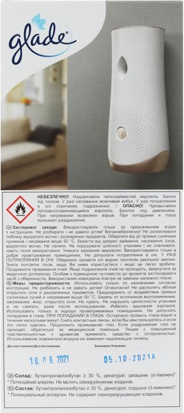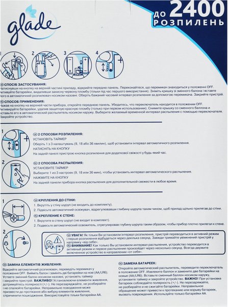 Для свіжого і легкого аромату у вашому домі скористайтеся освіжувачем повітря аерозоль від торгової марки Glade! Він ефективно бореться з неприємними запахами і наповнює простір навколо приємними ароматами. Основою для створення ароматів аерозолів Glade послужила сама природа. Ви можете скористатися ними у ванній, кухні, вітальні, спальні та кабінеті. Після розпилення кімната буде пахнути тонким ароматом свіжості.