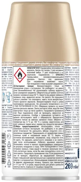 | Склад | ≥ 30%: propellant (butane, propane, isobutane), denatured, <5%: fragrance (benzyl salicylate, linalool, d-limonene, hexylcinnamal) |