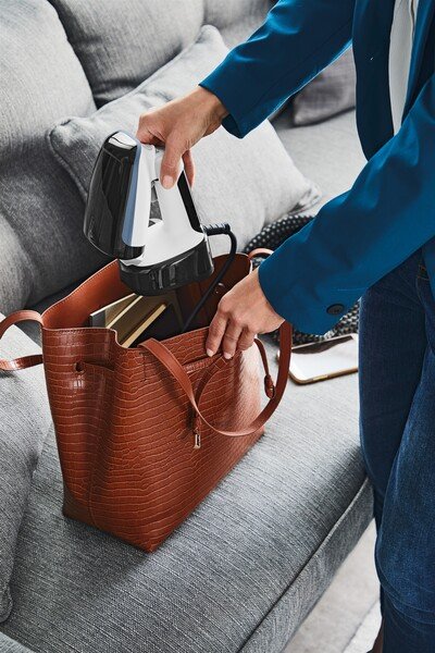 Ультракомпактний дизайн з ексклюзивною складною головкою забезпечує простоту зберігання та максимальну зручність — у форматі, вдвічі більшому порівняно з попередніми моделями — для портативної вертикальної праски, готової до подорожі та ідеальної для повсякденного використання.