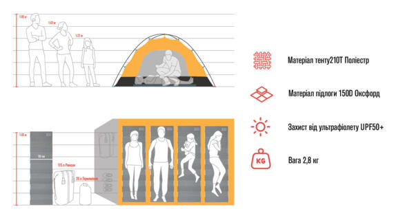 | Додатково | Намети туристичні чотиримісні, Каркасні намети |