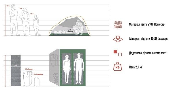 | Комплектація (можливі зміни в різних поставках) | Вітрова мотузка – 6 шт., Кілок – 15 шт., Намет, Сумка, Шест – 2 шт. |