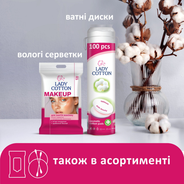 Ватні палички Lady Cotton - гігієнічний засіб, що випускається з органічного бавовняного полотна щільного та міцного намотування. Вироби призначаються для догляду за вушними раковинами і носовою порожниною. За допомогою них можна підправляти макіяж та манікюр, обробляти порізи й рани. Натуральність паличок підтверджена особливими сертифікатами Cotton Natural.