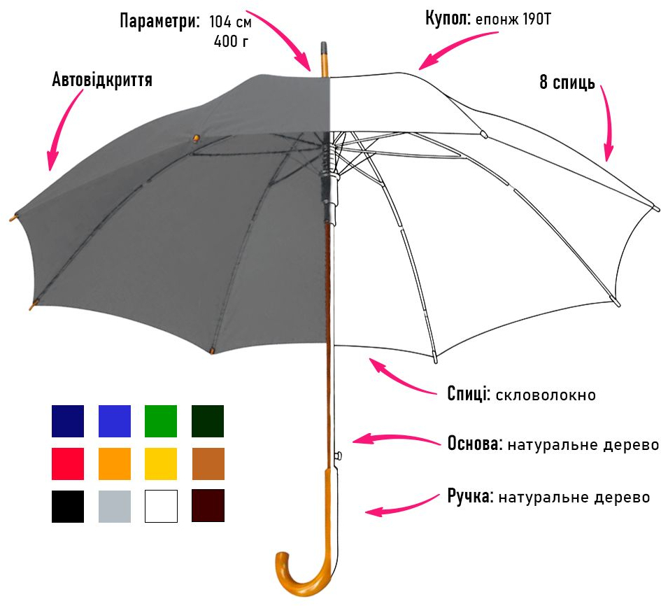 - Довжина напівавтоматичної парасольки — 88 см, вага — 400 г.