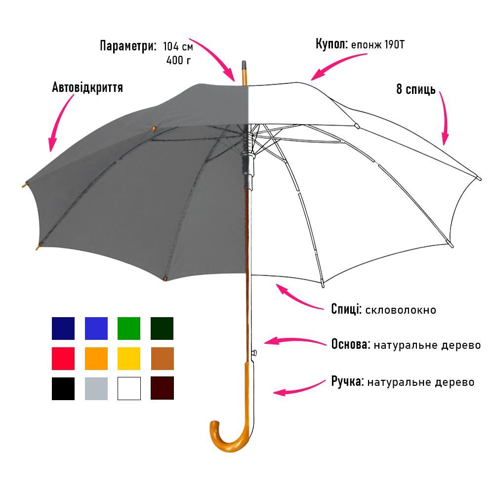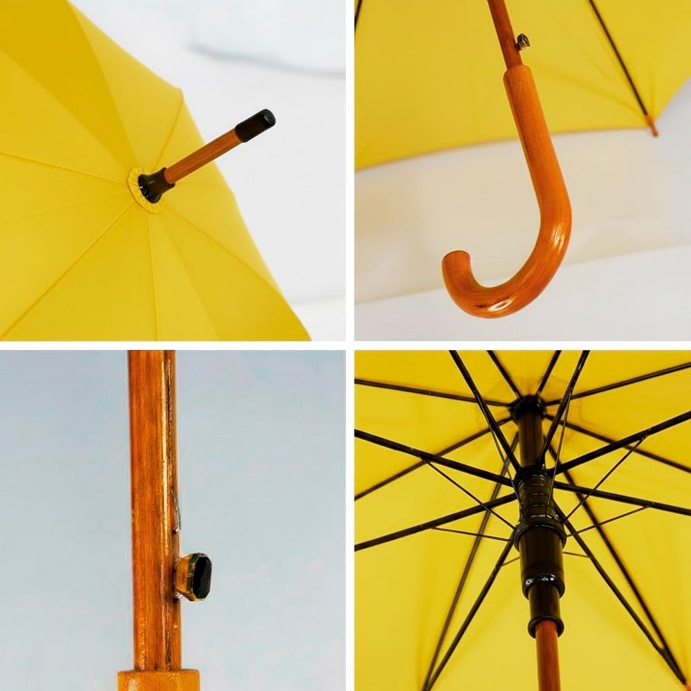 - Парасолька-тростина має суцільну ручку без телескопічного механізму, оснащена міцними металевими спицями;