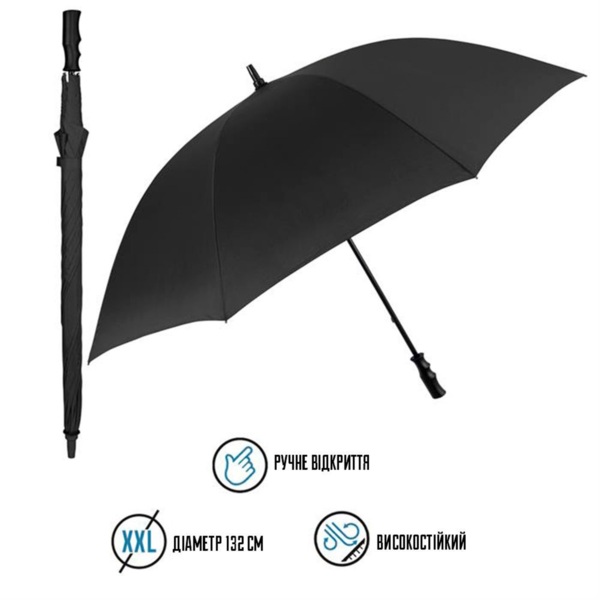 - Парасоля має ручне відкривання та пряму пластикову ручку чорного кольору з ергономічними виїмками для пальців, завдяки яким її зручно тримати тривалий час в будь-який вітер;