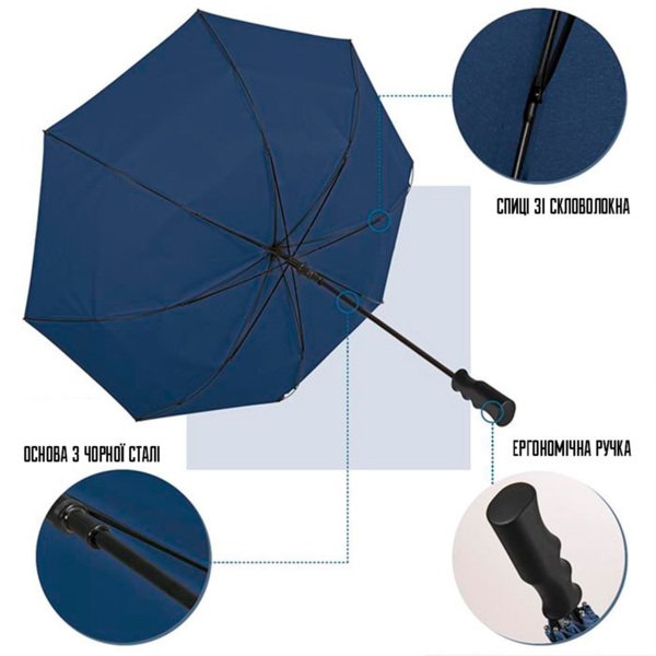 - Конструкція оснащена міцним чорним сталевим стрижнем та гнучкими 8 спицями зі скловолокна, які забезпечують стійкість до сильного вітру;