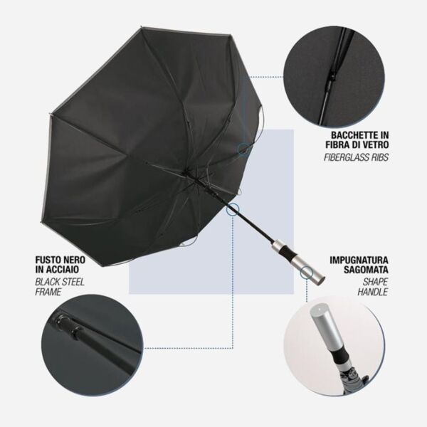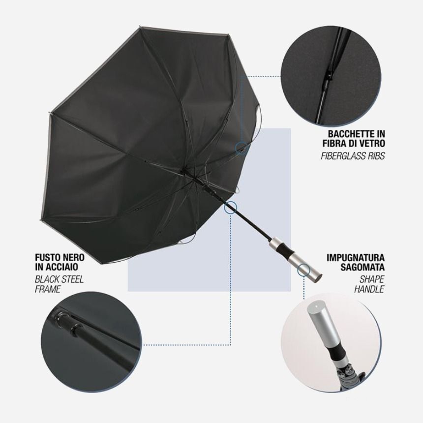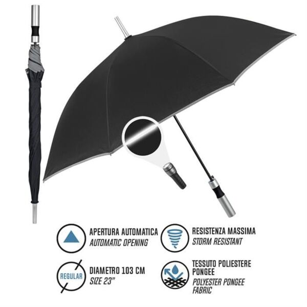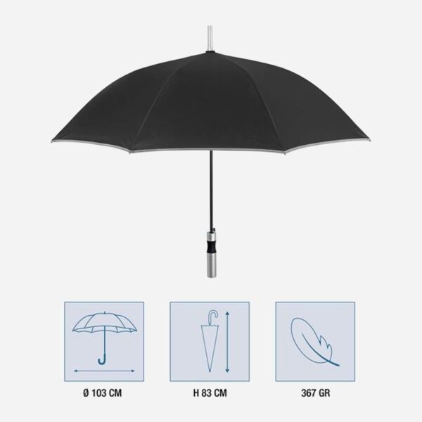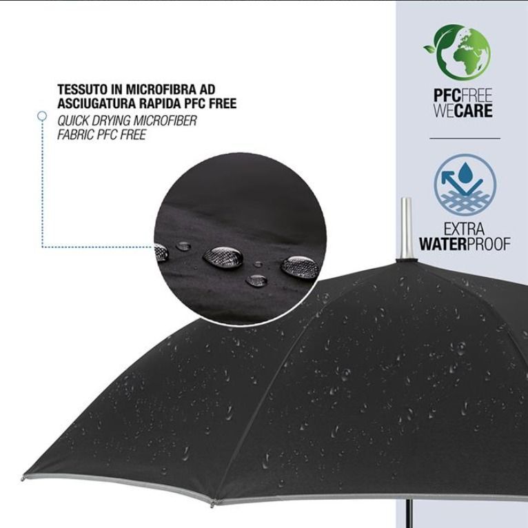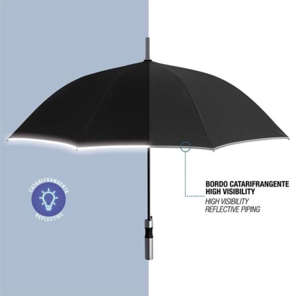 Парасолька-тростина Perletti Reflecting — це сучасна та практична автоматична модель із надійним вітрозахисним механізмом. Конструкція виготовлена з міцної та надійної сталі з 8 спицями, які витримують сильні пориви вітру. Купол виготовлений із матеріалу, що швидко висихає, не містить шкідливих PFC та має підвищену водонепроникність. Особливість моделі — світловідбиваючий кант по краю купола, який підвищує безпеку в темний час доби. Парасолька оснащена автоматичним відкриванням, що робить використання зручним навіть однією рукою. Пряма пластикова ручка має ергономічну форму для комфортного тримання.