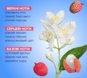 - Композиція розкривається свіжими нотами білих квітів та ягідного цвіту;