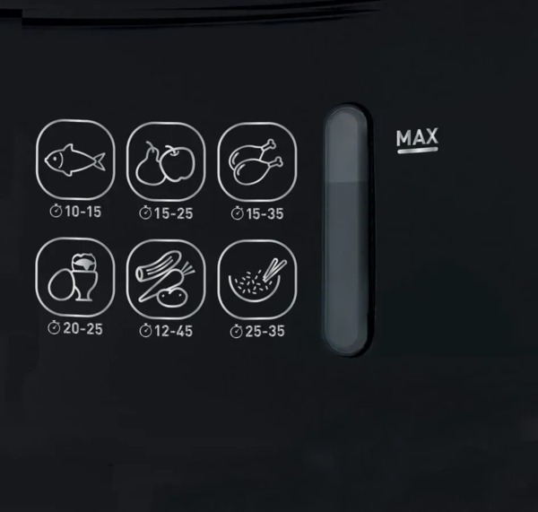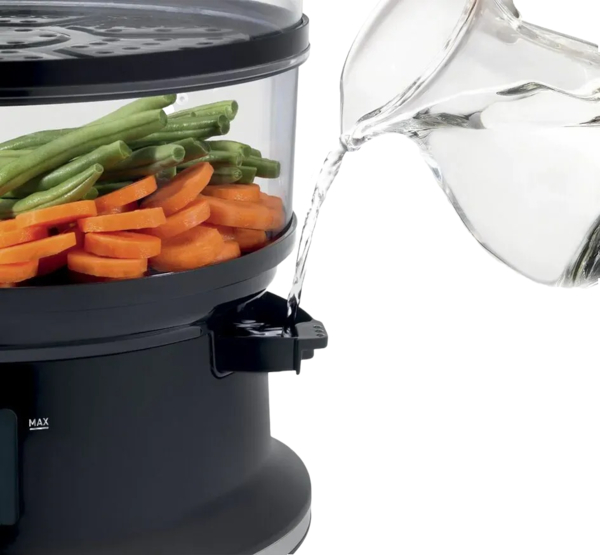 Чаші прозорі - ви зможете самостійно контролювати процес приготування. З метою контролю також є таймер на 60 хвилин, який автоматично вимкне прилад після закінчення потрібного часу. Зручним є наявність зовнішнього індикатора рівня води - через невелике віконце ви завжди можете наочно бачити, скільки води в резервуарі, без знімання парових кошиків. А якщо вода закінчується, то є можливість доливання прямо в процесі приготування.