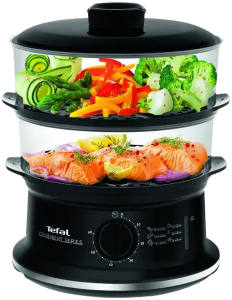 Довольно вместительная, отделения внутри распределены по характерному рисунку, чтобы во время приготовления отдельных продуктов, котлет например, можно было их расположить на правильном расстоянии друг от друга. Управление простое, справится даже первоклассник, нужно просто повернуть рычаг на нужный таймер, а дальше она сама приготовит и выключится. Кстати, в защиту от сгорания стоит реле которое автоматически выключает пароварку во время работы на несколько секунд. Тефаль выбрала по рекомендации подруги, все таки это известный бренд, так что сомнений не было. А цена на этом сайте мне показалась наиболее выгодной чем в других магазинах, жалко только что вверху нет зажимного клапана выпуска пара.