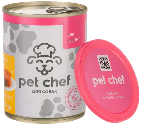 Pet Chef - ексклюзивний апетитний ситний продукт для собак за новою рецептурою в зручних банках, захищених кришкою. Консерви Pet Chef виробляються з українського м'яса і субпродуктів. Мінімальний відсоток зернових у преміальному кормі Pet Chef присутній для збалансування харчування вашого собаки, забезпечує повний спектр необхідних поживних речовин, необхідних на кожен день його щасливого життя. Pet Chef - це смачно, зручно і поживно.