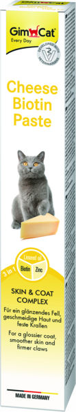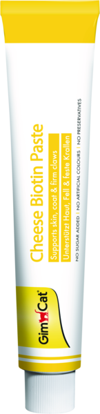 Паста GimCat Cheese Biotin містить комплекс смачного, справжнього італійського твердого сиру, біотин, цинк та лляну олію. Сир надає пасті неперевершеного смаку, а отже, і високої популярності серед котів. Функціональне поєднання біотину, цинку та лляної олії "три в одному" позитивно впливає на метаболізм шкіри та шерсті, сприяючи помітно блискучій та здоровішій шерсті, гладенькій шкірі та міцнішим кігтям. Пасту Cheese Biotin можна згодовувати як добавку, особливо під час линяння.