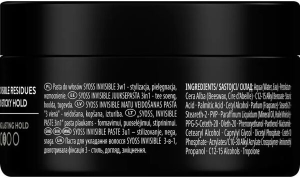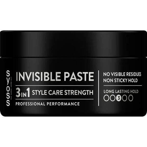 Паста для укладання волосся Syoss Invisible Paste 3 in 1 довготривала фіксація 3 - стиль, догляд, зміцнення. Засновані на більш ніж 45-річній історії догляду за волоссям, засоби для волосся Syoss створені для професійної якості. Стайлінг-паста для волосся надає довготривалу фіксацію без липкості та видимих залишків. Глибоко діюча формула Syoss зміцнює волосся зсередини. Вітамінний комплекс у поєднанні з пантенолом та ніацинамідом для зміцнення структури волосся. Для красивого та здорового на вигляд волосся. Формула не містить спирту і силіконів.