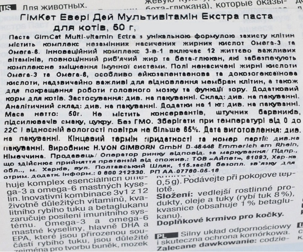 Паста GimCat Every Day Multi-Vitamin Paste для доповнення щоденного раціону та підтримки загального стану здоров'я котів. Паста GimCat Multi-Vitamin Paste містить унікальний комплекс 3 в 1, що містить 12 життєво важливих вітамінів, таурин, дріжджову культуру (містить 1% бета-глюкану) та біологічно цінні олії, які надають комплексний зміцнювальний вплив на імунну систему та активізують захисні функції організму.