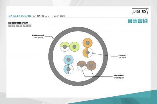 Сполучні кабелі DIGITUS розроблені спеціально для задоволення будь-яких вимог для різноманітного використання в різних сферах. Кожен кабель оснащений обтисненою гільзою із захистом від зламу, з кабельним уведенням. Гільза має також запобіжник стопорного важеля, який запобігає залипанню кабелів та одночасно оберігає від відламування стопорного важеля від роз`єму. Проста ідентифікація кабелю категорії 6 завдяки роз`єму червоного кольору.