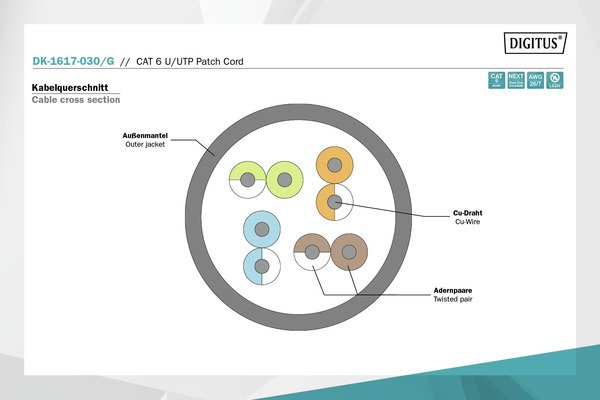 З`єднувальні кабелі DIGITUS категорії 6 класу E виробляються та випробовуються на відповідність до вимог ISO/IEC 11801 та стандарту DIN EN 50173 CAT 6. Гарантія відповідності кабельного з`єднання вимогам специфікації ISO&EN, а також наявність чудових функціональних характеристик кабельного з`єднання DIGITU. 250 МГц, включаючи такі функціональні характеристики, як, наприклад, перехресні перешкоди на ближньому кінці.