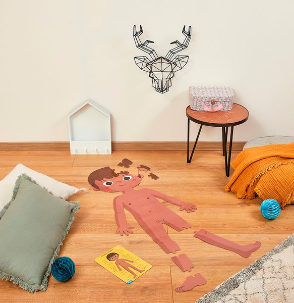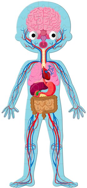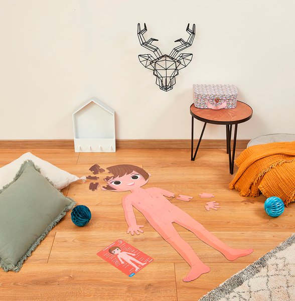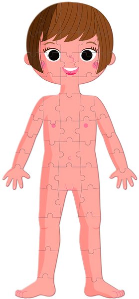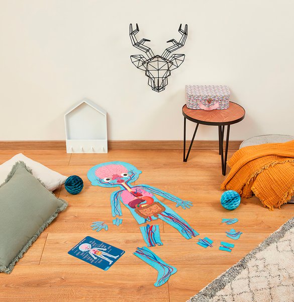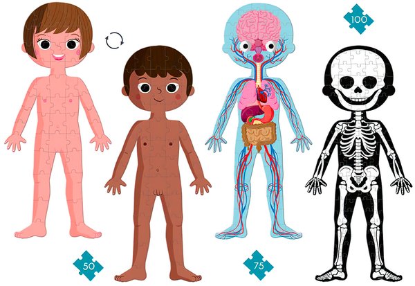4 велетенські пазла на тему – тіло людини: 1 Пазл- двосторонній пазл хлопчик/дівчинка (50 ел.); 1 Пазл- вивчення органів (75 ел.); 1 Пазл- скелет (100 ел.). Пазли в зібраному вигляді мають висоту 1 метр і допомагають дітям краще зрозуміти своє тіло. Пазл включає в себе докладні освітні карти, щоб дізнатися про різних частинах тіла людини. Рекомендований вік: 5 +; розмір: 45 х 100 см