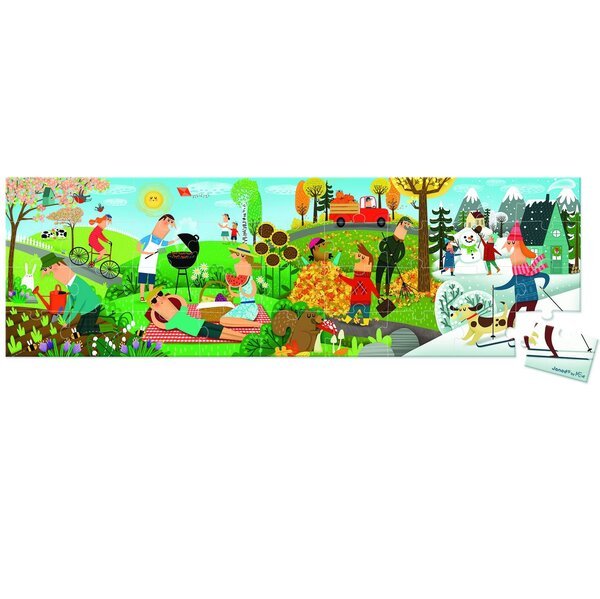 Цікавий і яскравий панорамний пазл для дітей від французького бренду Janod. У набір входить постер і 36 великих деталей. Правильно склавши картинку, діти побачать цікаве зображення, на якому зліва направо проілюстрований перехід між чотирма сезонами: весна – літо – осінь – зима. Сучасні малюнки, приємні на дотик матеріали і зручна упаковка – неодмінно сподобаються малюкам. Упаковка у вигляді сумочки з ручкою, в якій пазли можна брати з собою. Розмір складеного пазла: 80х25 см.