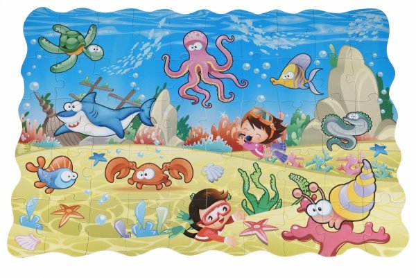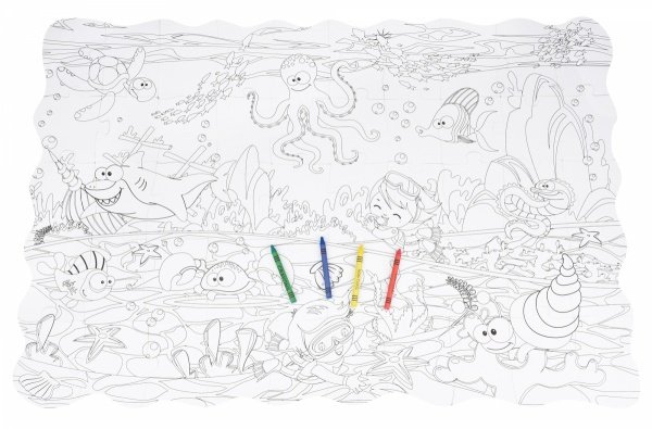 «Підводний світ» – незвичайний пазл для дітей від трьох років. Це одночасно розвиваюча іграшка і набір для творчості. Пазл складається з 50 фрагментів. На лицьовій стороні деталей – яскраві зображення, нанесені якісними фарбами. На звороті – те ж зображення, тільки чорно-біле. Перед дитиною завдання – зібрати пазл. А перевернувши зібрану картинку на «чорно-білу» сторону, можна її розмалювати. Для цього в наборі 4 кольорові воскові олівці. ЗА допомогою такої гри діти будуть розвивати моторні навички, покращувати пам'ять і уважність.