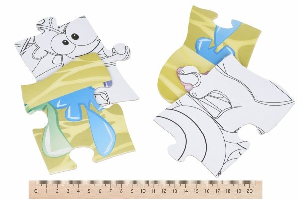 Здравствуйте, Дарья. Пазл можно будет разрисовать любыми карандашами или фломастерами, но наиболее яркая картинка получается при раскрашивании восковыми карандашами, идущими в комплекте.
