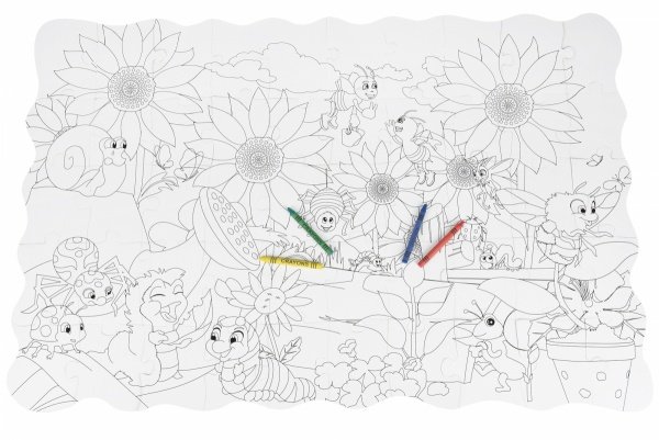 Незвичайний пазл «Жуки на задньому дворі» – одночасно розвиваюча іграшка і набір для творчості. Пазл складається з 50 фрагментів з яскравим зображенням різних комашок і квітів. Фрагменти пазла виготовлені з щільного картону, вони не гнуться, а на дотик гладкі. Дитині буде приємно їх розмальовувати. Збираючи пазл, діти будуть розвивати дрібну моторику, координацію і спритність рухів, а шукаючи необхідне місце для вкладкаа, пам'ять і логічне мислення. Особливість пазла в тому, що зі зворотного боку фрагменти чорно-білі. Перед дитиною завдання – розфарбувати їх. Для цього в наборі 4 кольорові воскові олівці. Зібрана картинка розміром 82х54 см.
