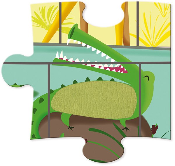 Тактильний пазл із зображенням зоопарку – оригінальна іграшка для дітей від 3 років. Особливість цього пазла в тому, що окремі частини картинки мають своєрідну текстуру. Всього на пазлі 7 різних текстур. Просто доторкніться до зображень і відчуйте різницю. Зображення тигра, жирафа і коали покриті текстурою, що імітує хутро, крокодила і мавпи – шкіру, металевий ефект відчуваєш, коли торкаєшся до хамелеона і ін. Така іграшка буде сприяти розвитку дрібної моторики, тактильного сприйняття у дітей. Виробник – французький бренд Janod.