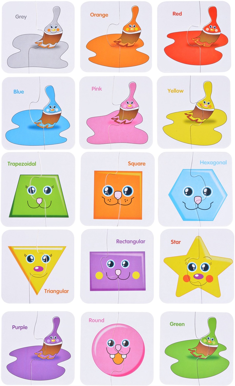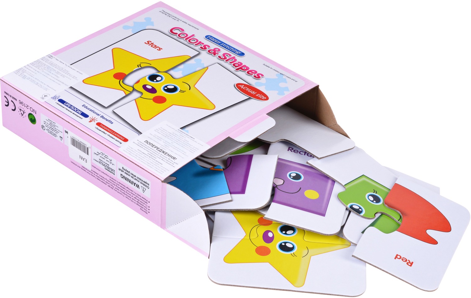 Навчальні пазли Кольори та фігури для малюків. Дитина повинна з'єднати в пари геометричні фігури, відповідно до того, яку форму і колір має кожен предмет. Гра розвиває дрібну моторику рук, сприйняття світу, відмінність кольорів і форм, тактильні навички, уяву, логічне мислення, пам'ять і увагу. Фрагменти пазла виготовлені з міцного картону. Рекомендований вік: 3+.