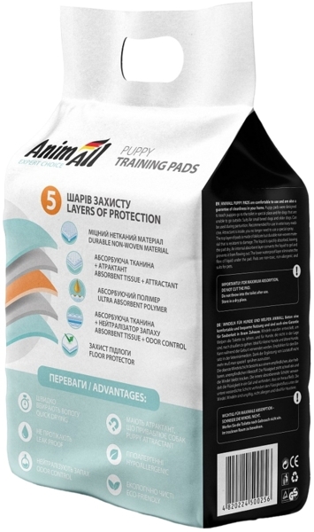 Пелюшки для собак і цуценят AnimAll - забезпечують комфортне і зручне використання, а також є гарантією чистоти у Вашому домі. Пелюшки призначені для привчання цуценят до туалету, і для собак, які не мають можливості виходити на вулицю. Ідеально підходять для собак малих порід і літніх собак. Можна використовувати під час пологів. Завдяки додаванню аттрактанта більше не потрібно використовувати спеціальний спрей. Верхній шар пелюшок виготовлений з ніжного, але міцного нетканого матеріалу, стійкого до пошкоджень. Рідина швидко поглинається, залишаючи пелюшку сухою. Внутрішній абсорбуючий шар перетворює рідину на гель і перешкоджає її витіканню. Нижній водонепроникний шар виключає протікання рідини під пелюшку.