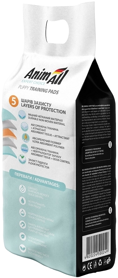 Пелюшки для собак і цуценят AnimAll - забезпечують комфортне і зручне використання, а також є гарантією чистоти у Вашому домі. Пелюшки призначені для привчання цуценят до туалету, і для собак, які не мають можливості виходити на вулицю. Ідеально підходять для собак малих порід і літніх собак. Можна використовувати під час пологів. Завдяки додаванню аттрактанта більше не потрібно використовувати спеціальний спрей. Верхній шар пелюшок виготовлений з ніжного, але міцного нетканого матеріалу, стійкого до пошкоджень. Рідина швидко поглинається, залишаючи пелюшку сухою. Внутрішній абсорбуючий шар перетворює рідину на гель і перешкоджає її витіканню. Нижній водонепроникний шар виключає протікання рідини під пелюшку.