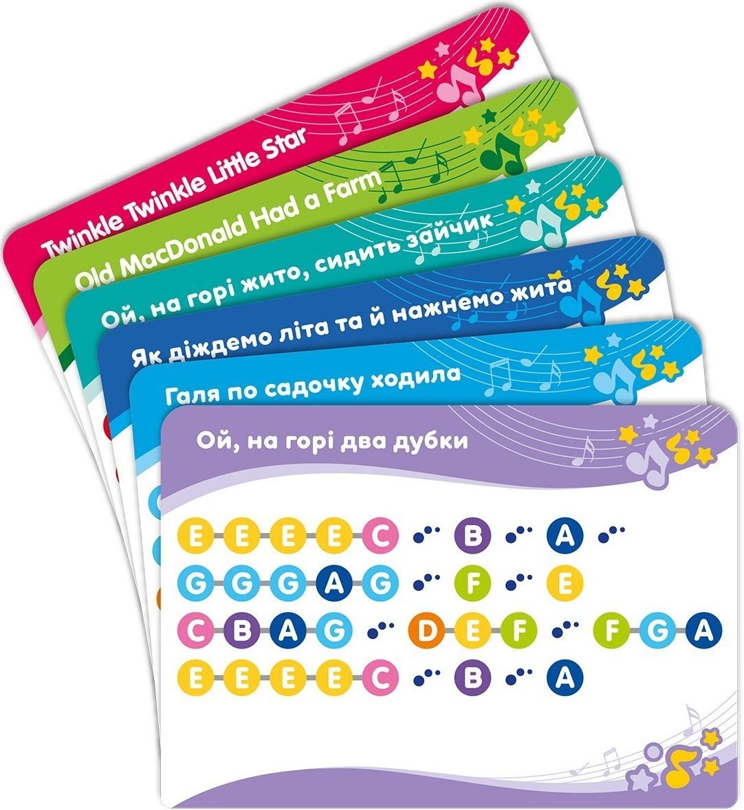 - 12 нотних карток — з нотами українських та англійських пісеньок, які можна вставити у спеціальне заглиблення;