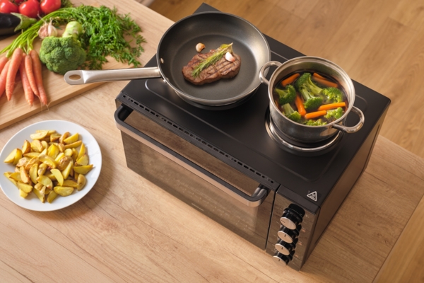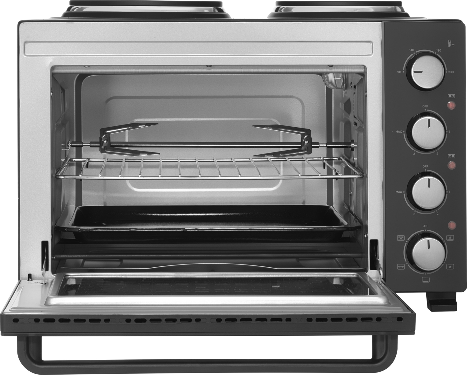 Електрична духовка Sencor з конфорками легко справляється з приготуванням супів, соусів, запіканням макаронних страв і навіть запіканням цілого курча завдяки загальній потужності 3200 Вт та об’єму 35 л. Для більшої зручності передбачене внутрішнє освітлення.