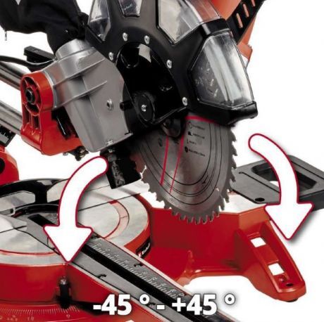 Поворотна пиляльна головка (вправо/вліво до 45 град) і поворотний стіл з точним регулюванням кута від -47° до +47°. Пиляльна головка регулюється безступінчасто.