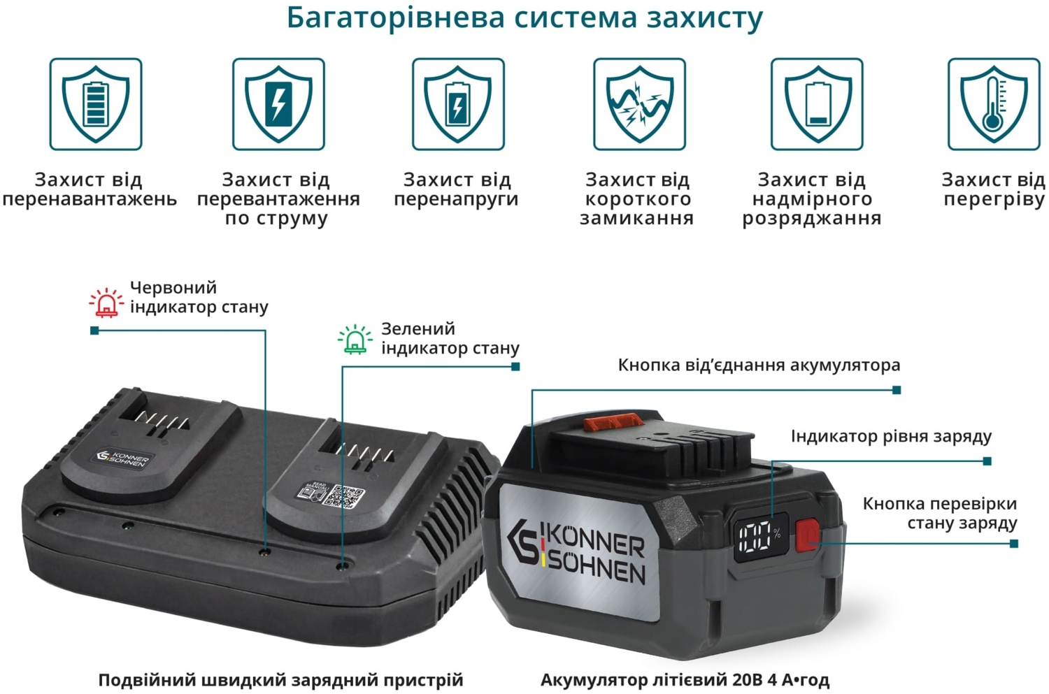 - Пила ланцюгова акумуляторна Konner&Sohnen KS CS40V-14 40В(20+20В), АКБ 2х4Аг (KSCS40V-14SET)