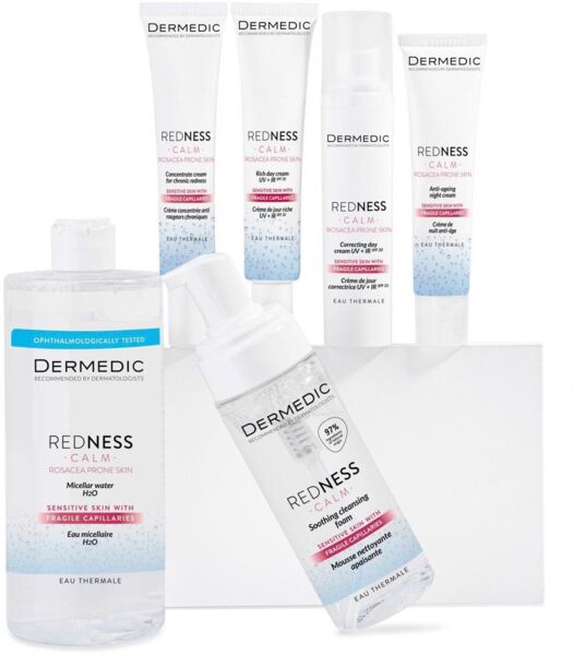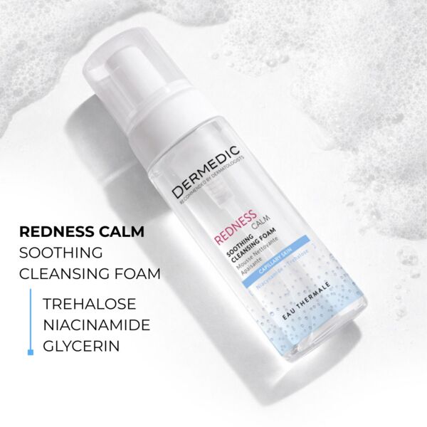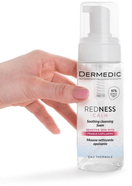 Заспокійлива пінка Dermedic Redness Calm Soothing створена для щоденного очищення шкіри, схильної до куперозу, розацеа, гіперчутливості, почервоніння та утворення судинних зірочок. Засіб з м'якою формулою миттєво заспокоює епідерміс, сприяє боротьбі із запаленнями, дарує м'якість, гладкість та еластичність. Пінка усуває поверхневі та глибокі забруднення, не порушуючи фізіологічний pH-баланс.