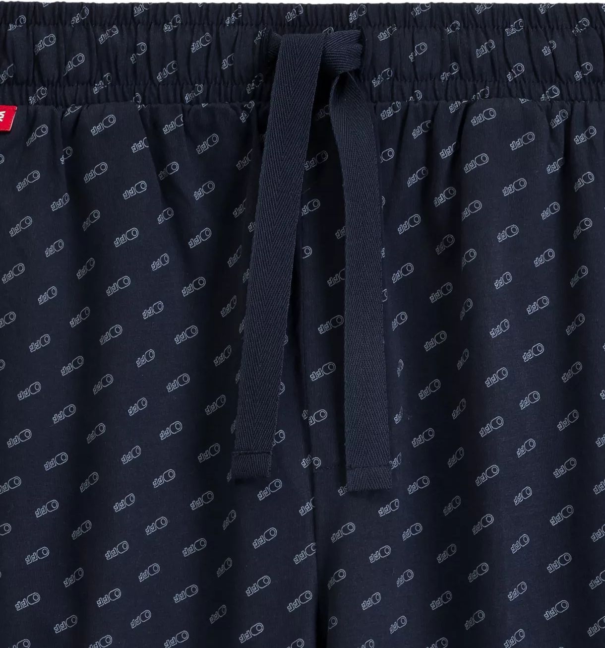 Штани темно-синього кольору оздоблені дрібними написами “OFF”, мають прямий крій та доповнені бічними кишенями. Еластична гумка та шнурок до пояса дозволяють відрегулювати посадку по фігурі, забезпечуючи максимальний комфорт.