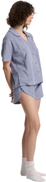 Жіноча піжама з м'якої махрової тканини — ідеальний вибір для комфортного відпочинку та сну. Комплект складається з сорочки вільного крою та шортів на еластичному поясі. Сорочка має класичний відкладний комір, короткі рукави та зручну застібку на ґудзики. Невелика накладна кишеня на грудях підкреслює стильність моделі. Шорти з м’яким поясом та шнурком забезпечують комфортну посадку, а фігурний крій додає легкості та свободи рухів. Завдяки приємній на дотик махровій тканині піжама чудово пропускає повітря, зберігаючи відчуття затишку та тепла. Ідеально підходить для домашнього носіння та комфортного сну.