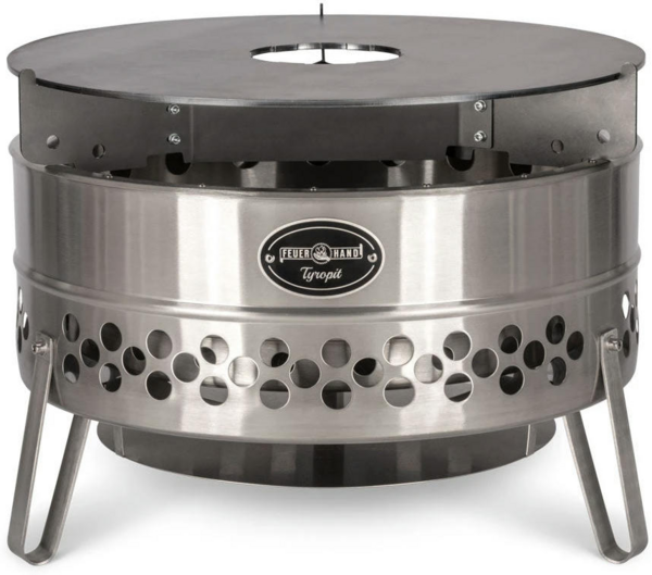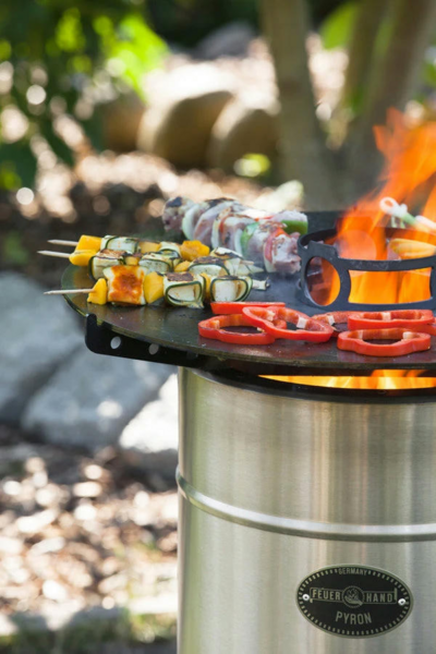 Планча Feuerhand Griddle Plate — доповнення до діжок для багаття Feuerhand Pyron і Tyropit. Встановлюється над камерою згоряння й перетворює прилад на кемпінгову кухню. Зроблена з 6-міліметрової німецької сталі.