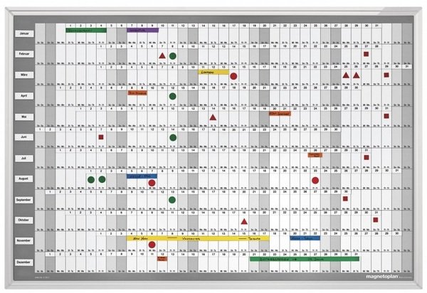 Календарна розмітка Year Planner Manager (12365S) – це таблиця, нанесена безпосередньо на поверхню магнітно-маркерної дошки, покритої спеціальним лаком. Поверхня планувальника сумісна з усіма існуючими магнітними аксесуарами, придатна для листа сухостираемими маркерами і спеціальними OHP-маркерами з водорозчинним чорнилом. Для постійного догляду за нею підходить більшість засобів для чищення magnetoplan.