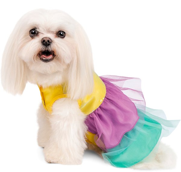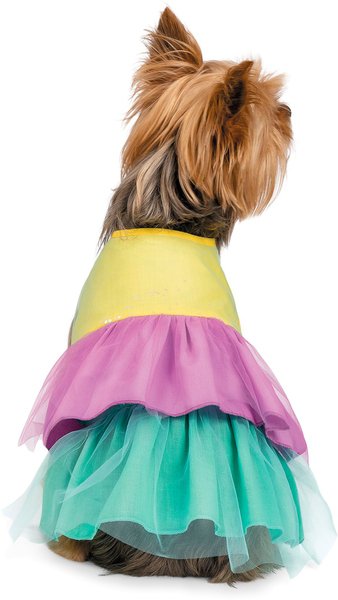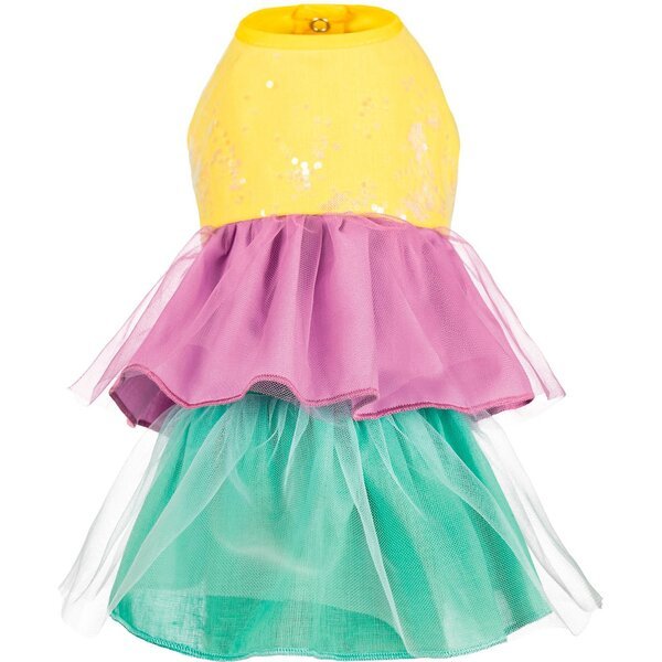 Ця яскрава сукня нагадує водночас північне сяйво і блиск зірок на небі. Сполучення бавовняної тканини і фатину створює відчуття легкості, ніжності. Верхня частина сукні прикрашена блискітками, а оборки роблять модель романтичною, вишуканою і водночас зручною та вільною. Чарівне вбрання для чотирилапих модниць!