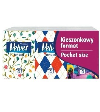 М`які та ніжні носові хустки Velvet 4-ply є міксом різних дизайнів з унікальною графікою. Всі хустки Velvet виготовлені зі 100% целюлози. Їхній кишеньковий розмір дозволяє легко поміститися в будь-яку кишеню, сумочку, шкільний рюкзак, косметичку, автомобіль тощо.