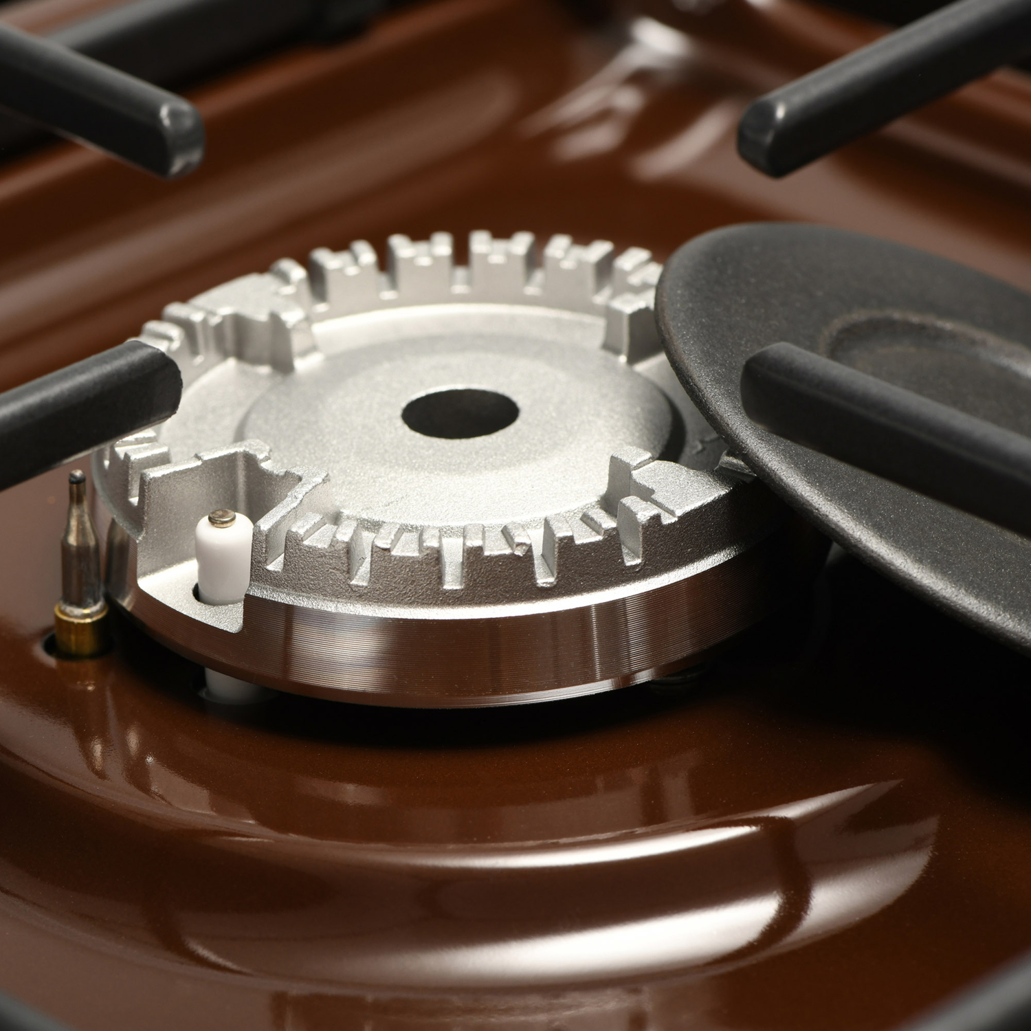 Плита належить до класу захисту I та категорії II2H3B/P, працює за напруги 220–240 V із частотою 50–60 Гц. Запалювання електричне за допомогою кнопки – просто та зручно, без сірників чи зайвих маніпуляцій. Система газ-контролю, яку вбудовано в усі конфорки поверхні та пальники духової шафи, миттєво припиняє подання газу в разі згасання полум’я, гарантуючи безпеку. Решітки вкрито матованою емаллю – міцні та зносостійкі, їх легко очистити після готування.