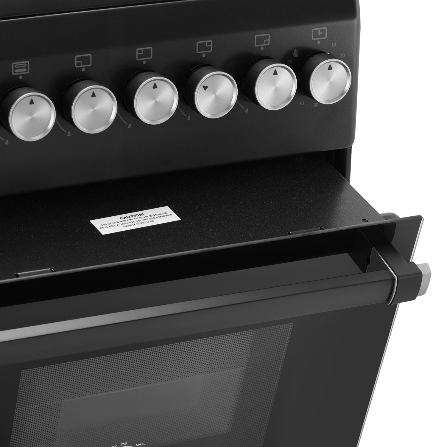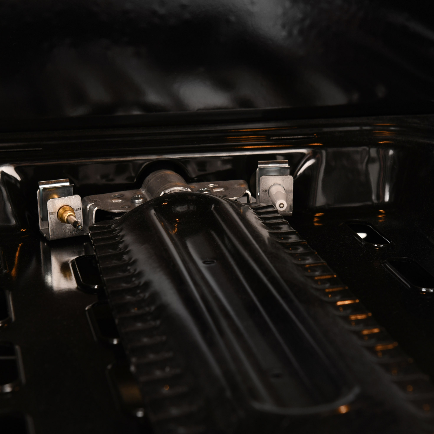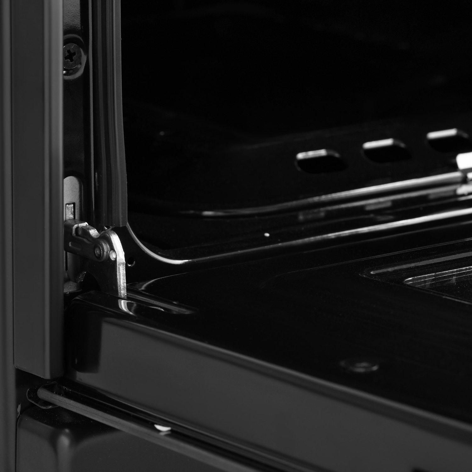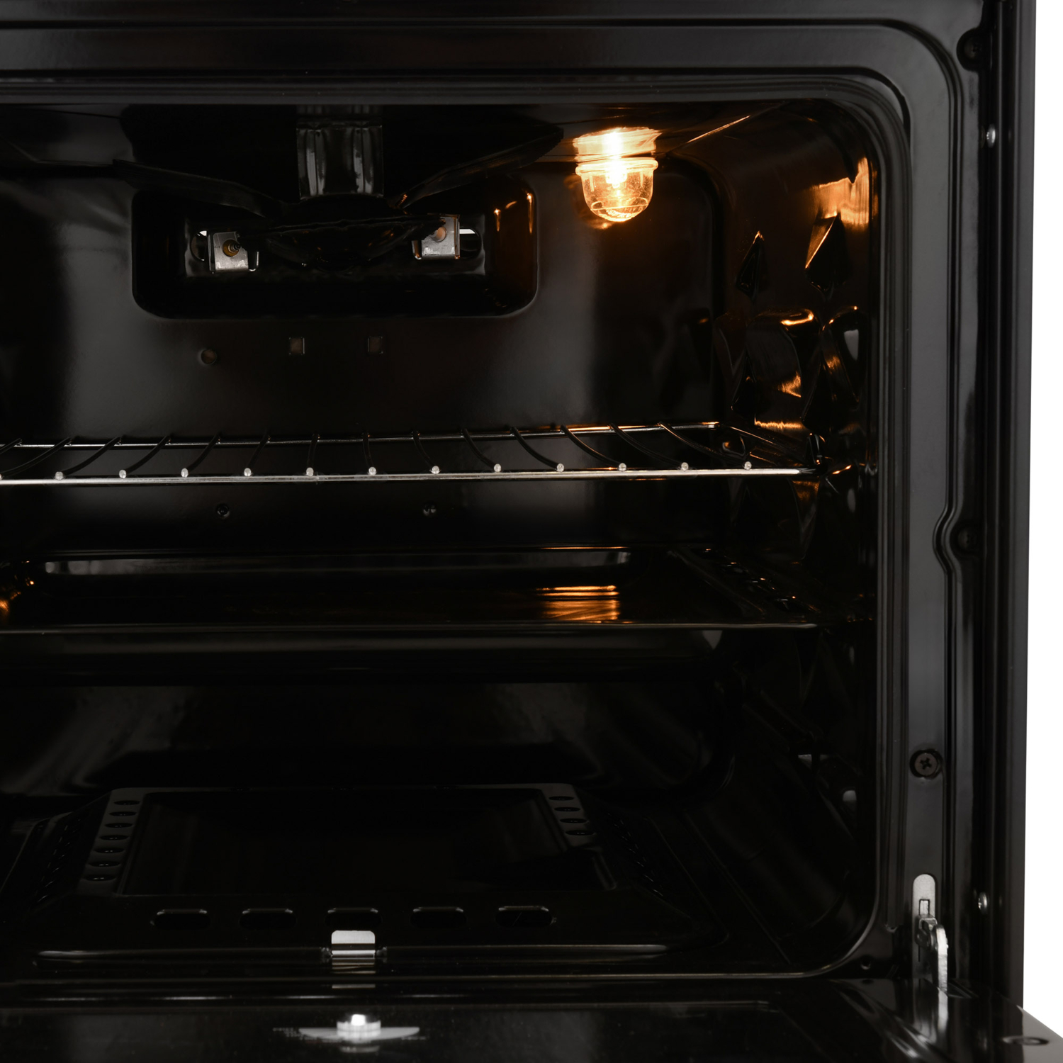 Газова духовка об’ємом 50 л має два нагрівальні елементи – верхній (2,2 кВт) та нижній (2,75 кВт), що забезпечують рівномірне приготування страв будь-якої складності. Підсвічування камери дає змогу контролювати процес готування без потреби відчиняти дверцята. Завдяки п’яти рівням рельєфних напрямних можна зручно розміщувати деко або решітку на потрібній висоті. Внутрішнє покриття камери – емаль легкого очищення. Знімне внутрішнє скло дверцят робить догляд за духовою шафою ще зручнішим, а клас енергоефективності А свідчить про економне споживання ресурсів.
